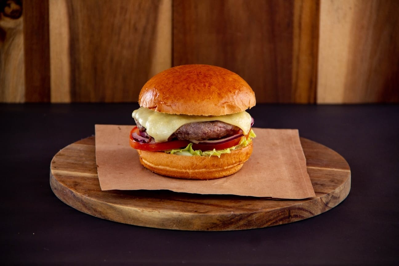 Pão brioche, hambúrguer na brasa, queijo, alface, tomate, cebola roxa, maionese da casa