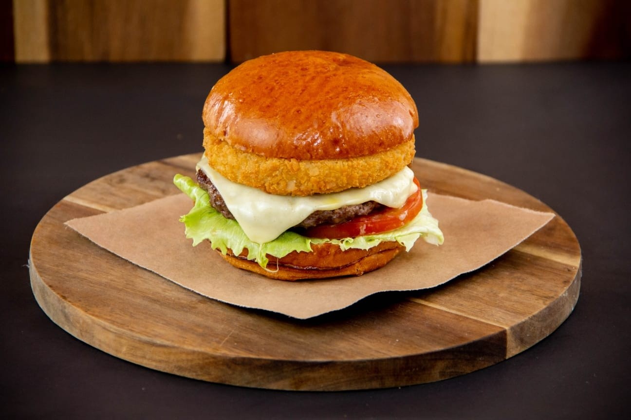 Pão, hambúrguer na brasa, queijo empanado, alface, tomate, maionese da casa